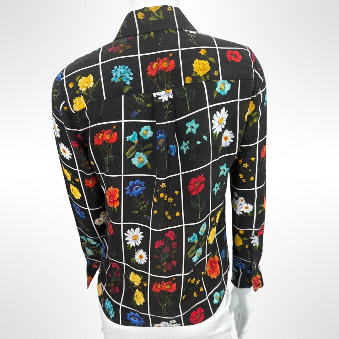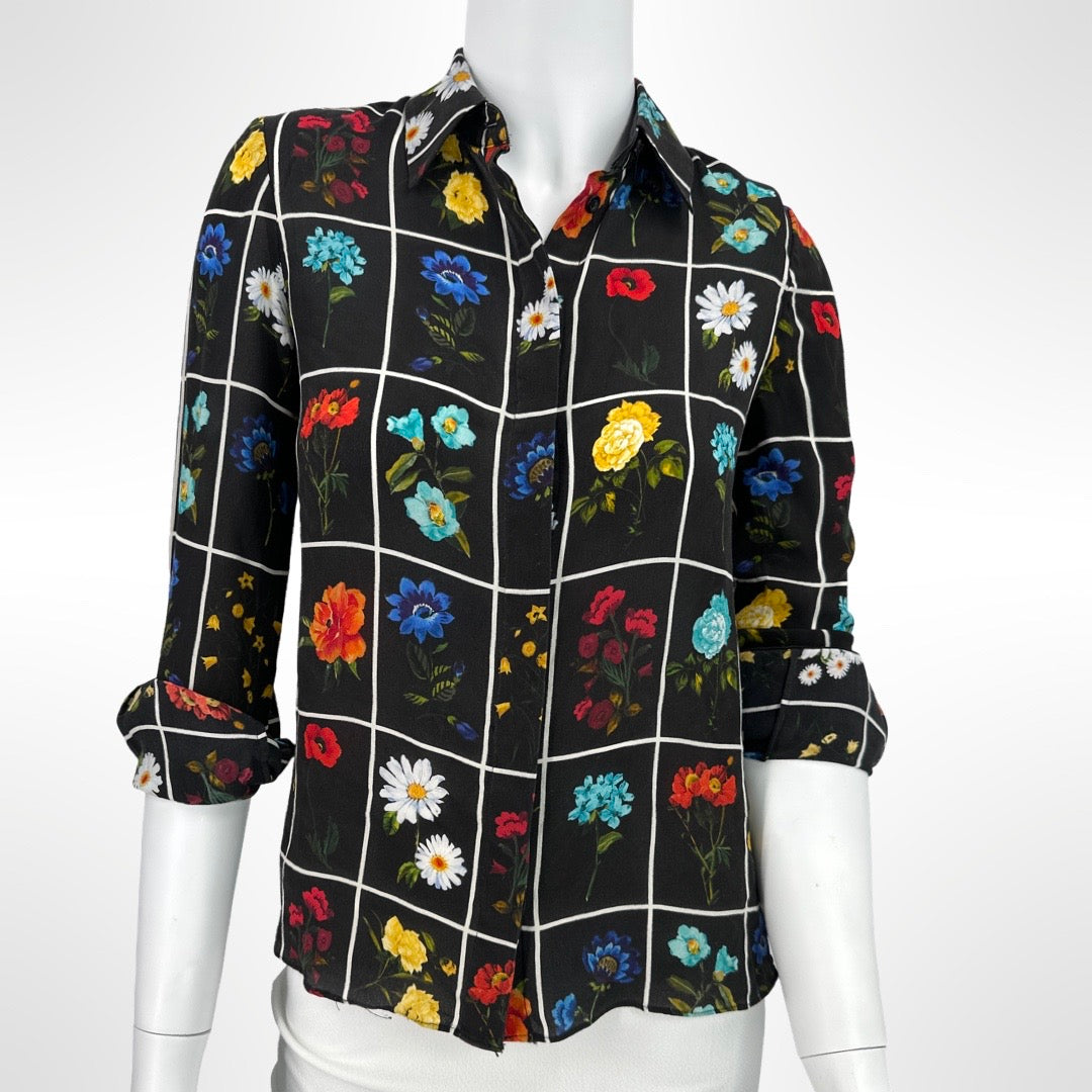 Turn heads in this stunning Alice + Olivia blouse, size XS, crafted from luxurious 100% silk. The striking grid print features bold, colorful blooms against a black backdrop, creating a modern-meets-romantic aesthetic. With a sharp collar, full button front, and long sleeves (can be rolled up for a relaxed vibe), this blouse is perfect for both work and weekend.