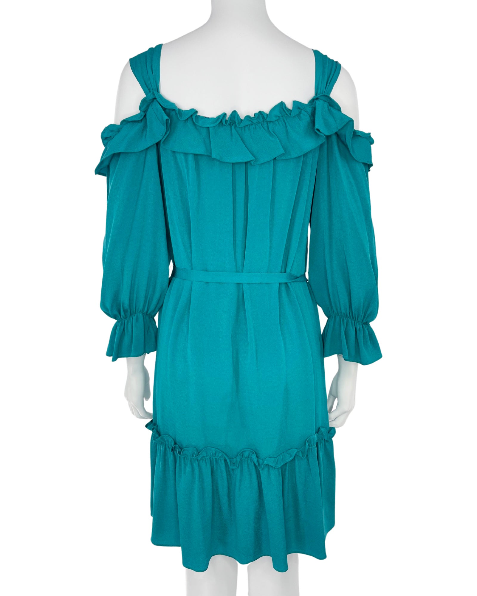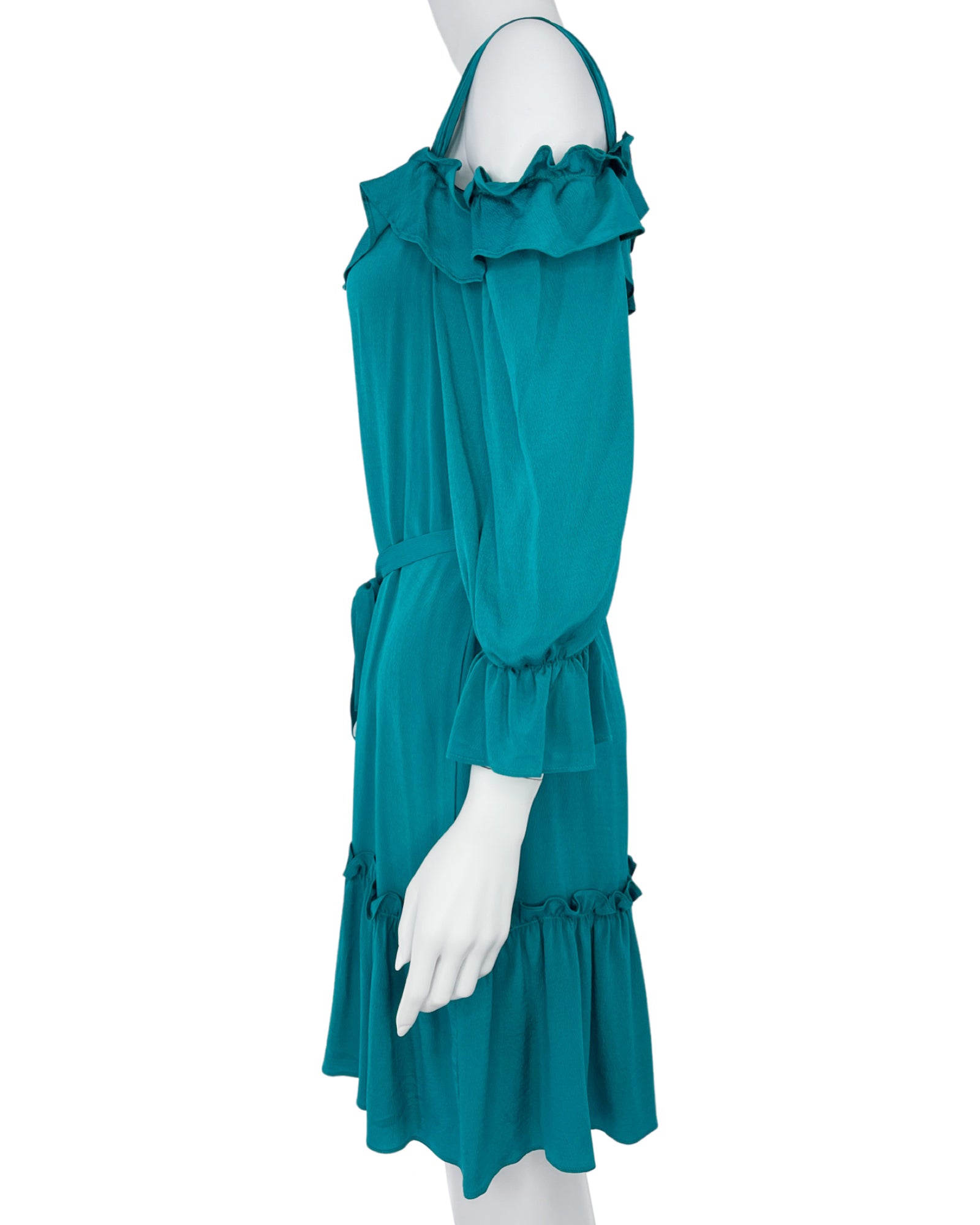 - Design: Above-the-knee teal silk ruffle dress, with long sleeves, and matching belt.