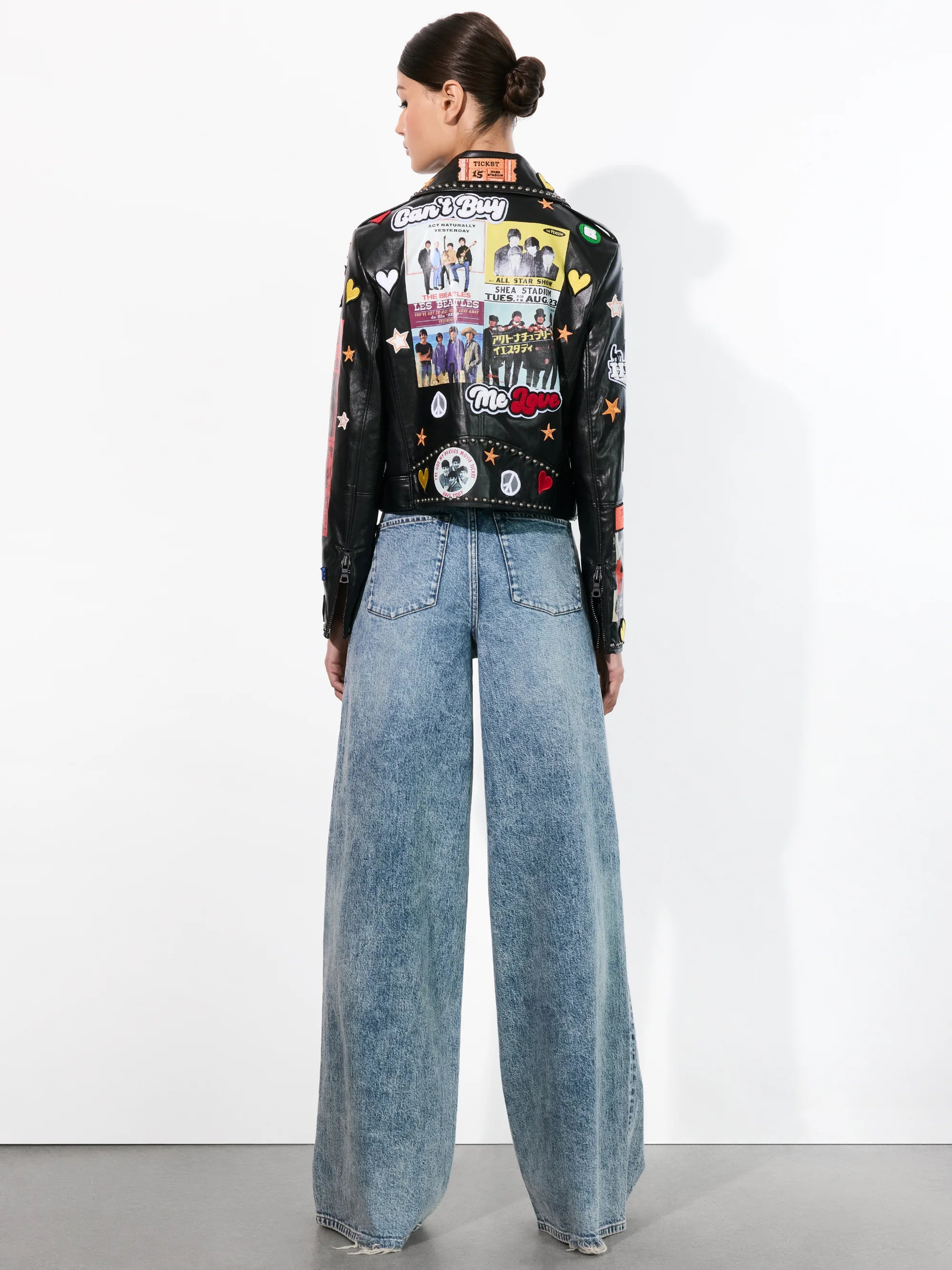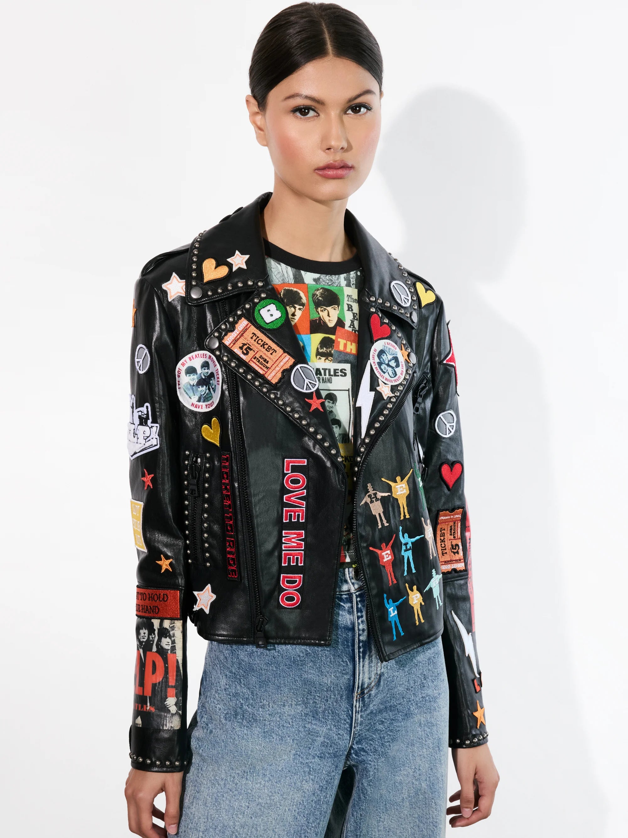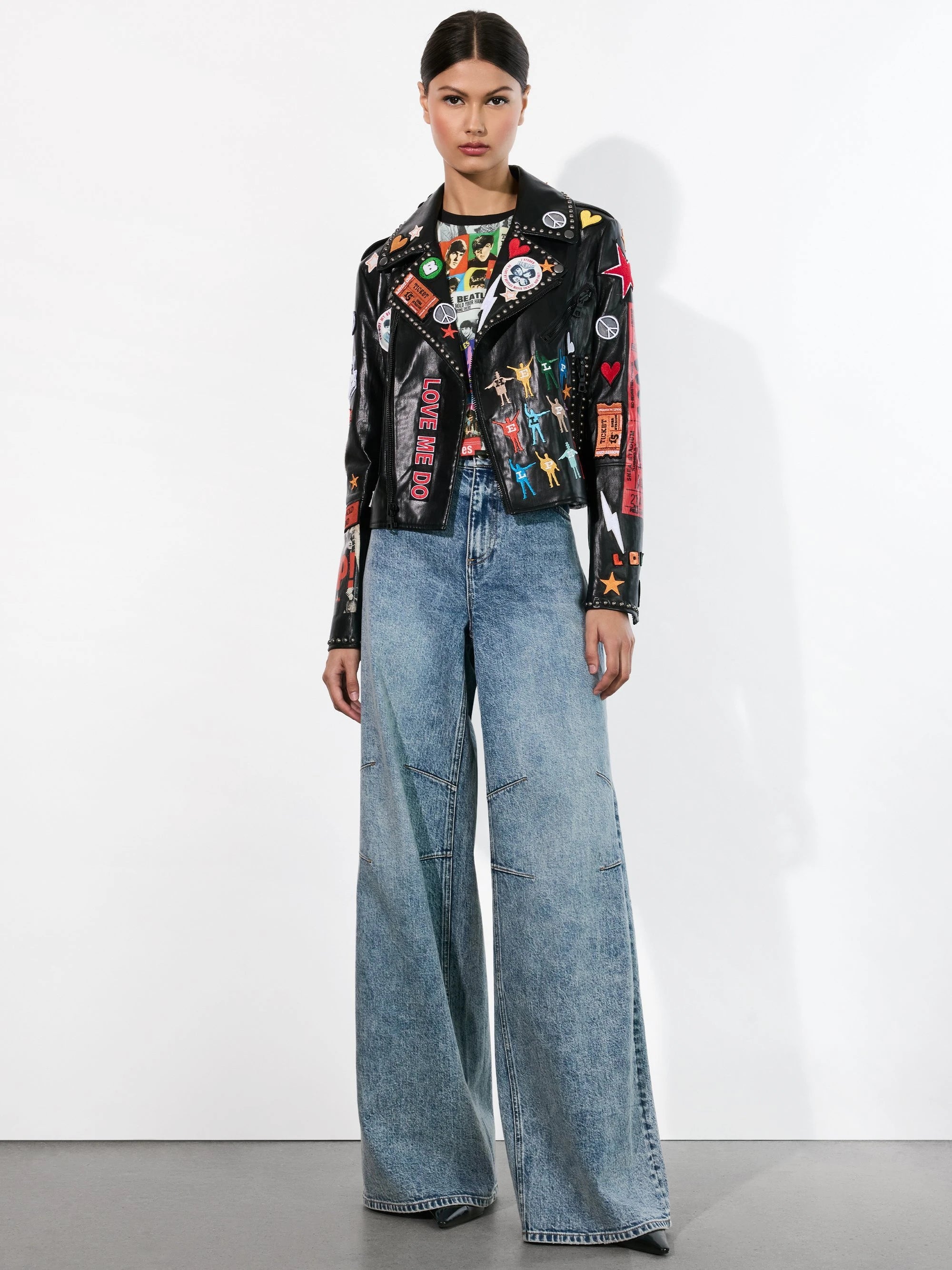 Alice and Olivia, A+O X The Beatles Cody Vegan Leather Jacket In Black Multi