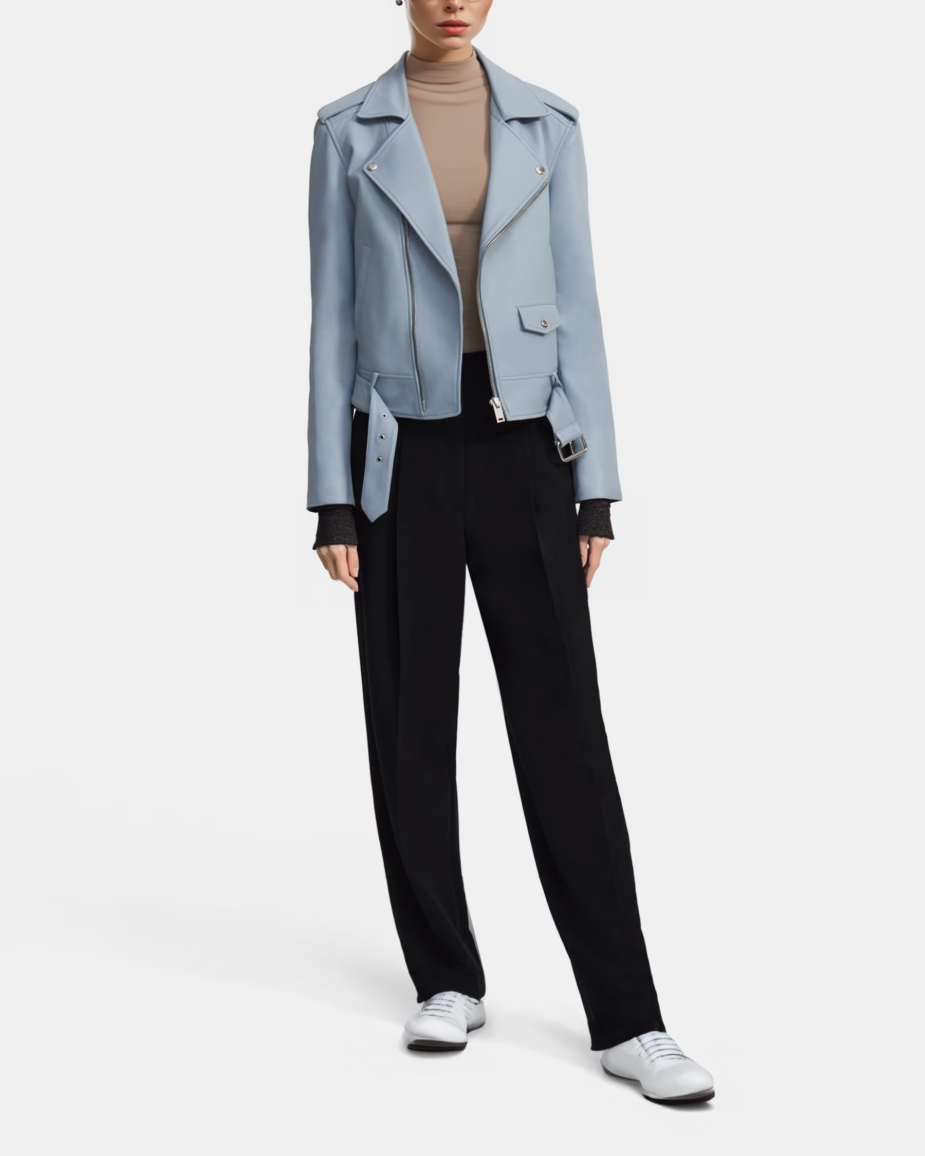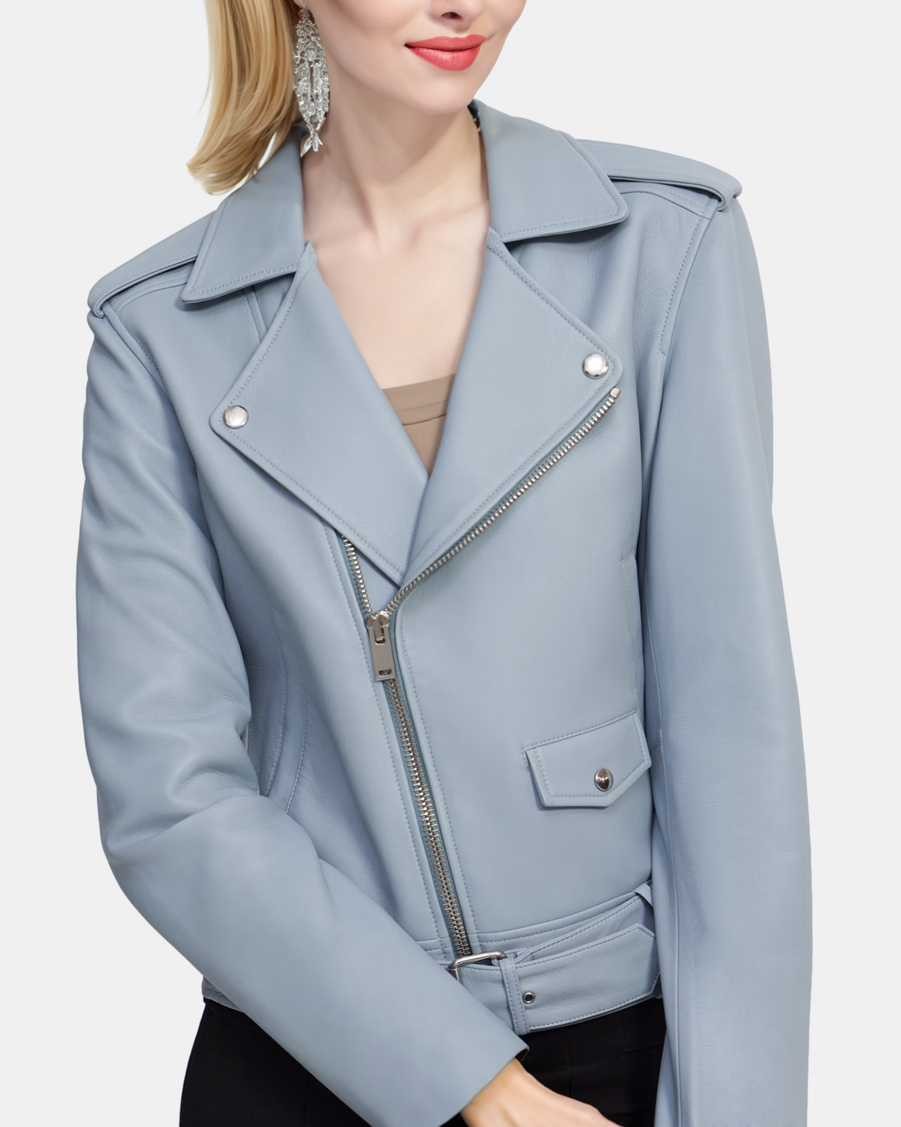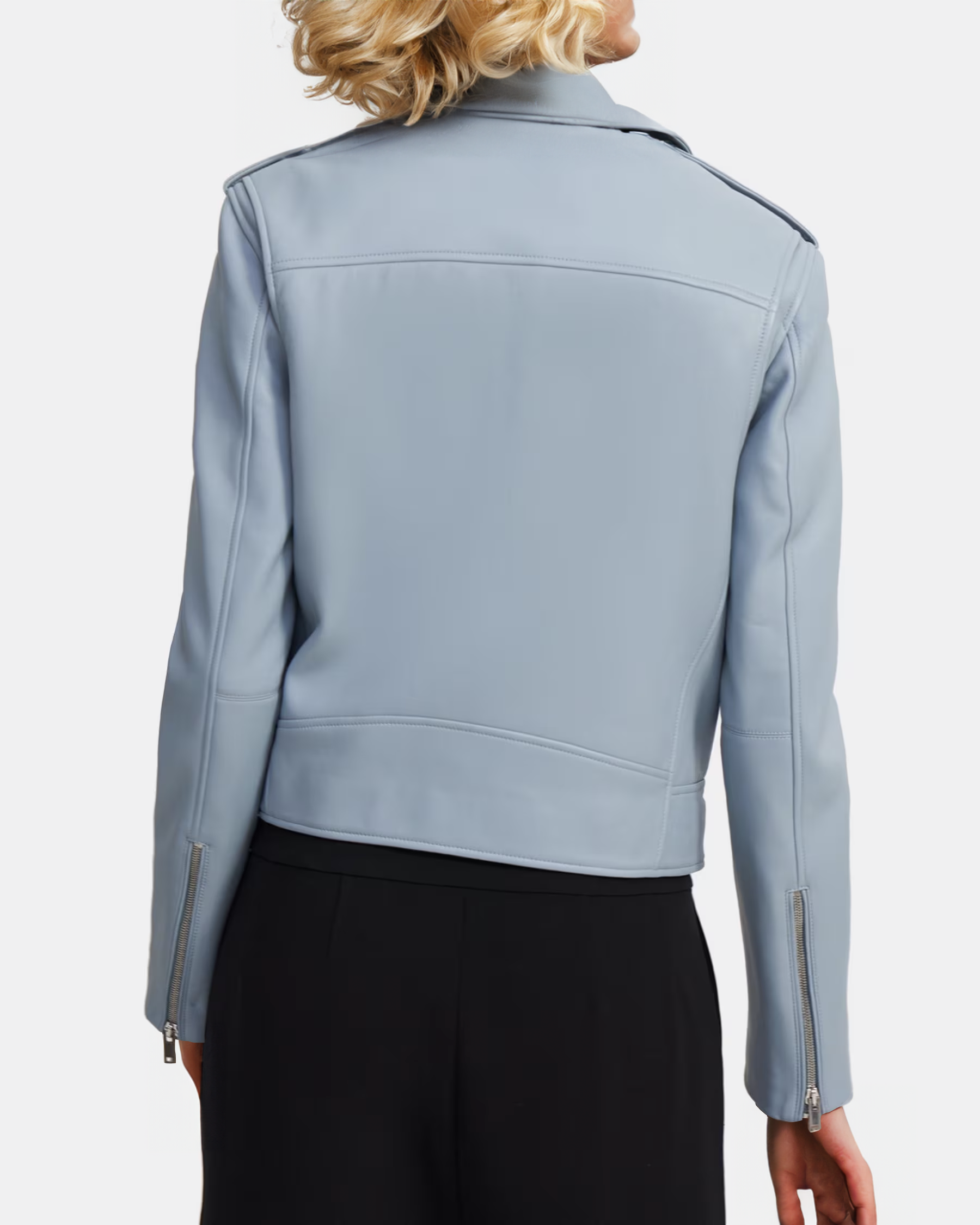 Theory Moto Jacket in Lambskin Leather Color Eggshell Baby Blue Relaxed Fit