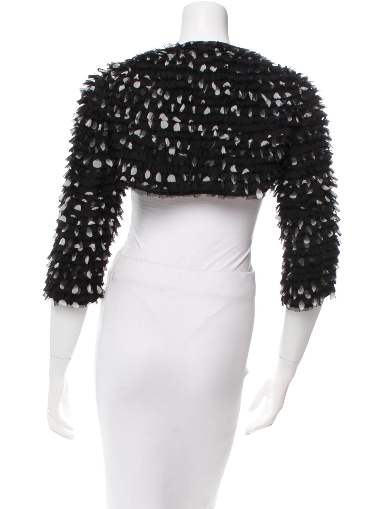 - Design: Black and white Dolce & Gabbana silk bolero with polka dot overlay featuring fringe edges throughout and single snap closure at front.
