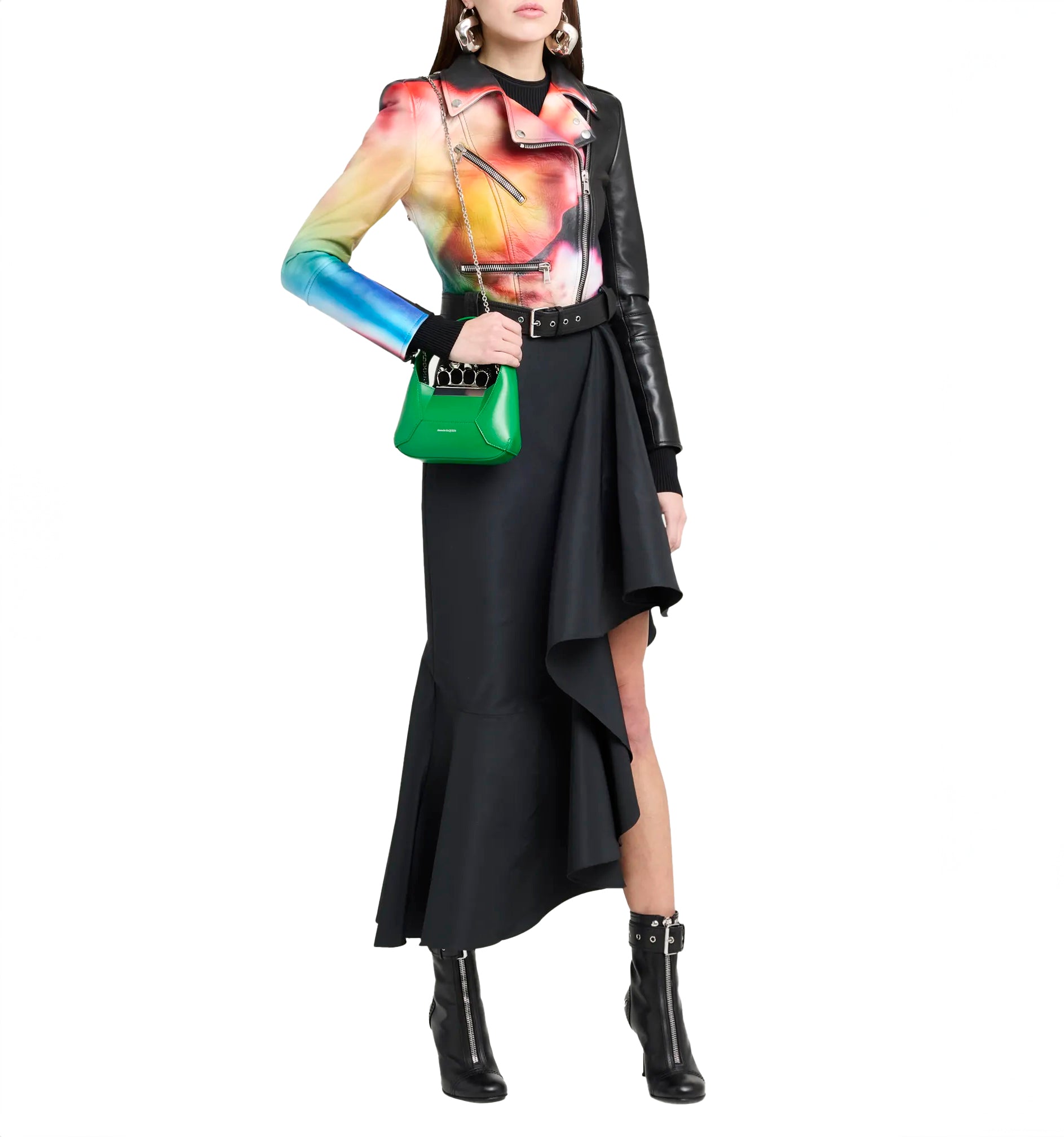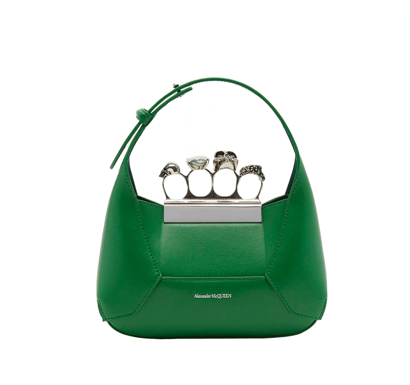 The ALEXANDER MCQUEEN Green Skull Jeweled Mini Chain Hobo Bag is crafted with high-quality calf leather and features an adjustable handle for versatility. The detachable chain strap allows it to be worn as a shoulder bag or carried as a top handle. Its signature skull four-ring knuckle duster and lift-clasp closure provide a secure and stylish way to carry your belongings. Made in Italy with attention to detail and expert craftsmanship.