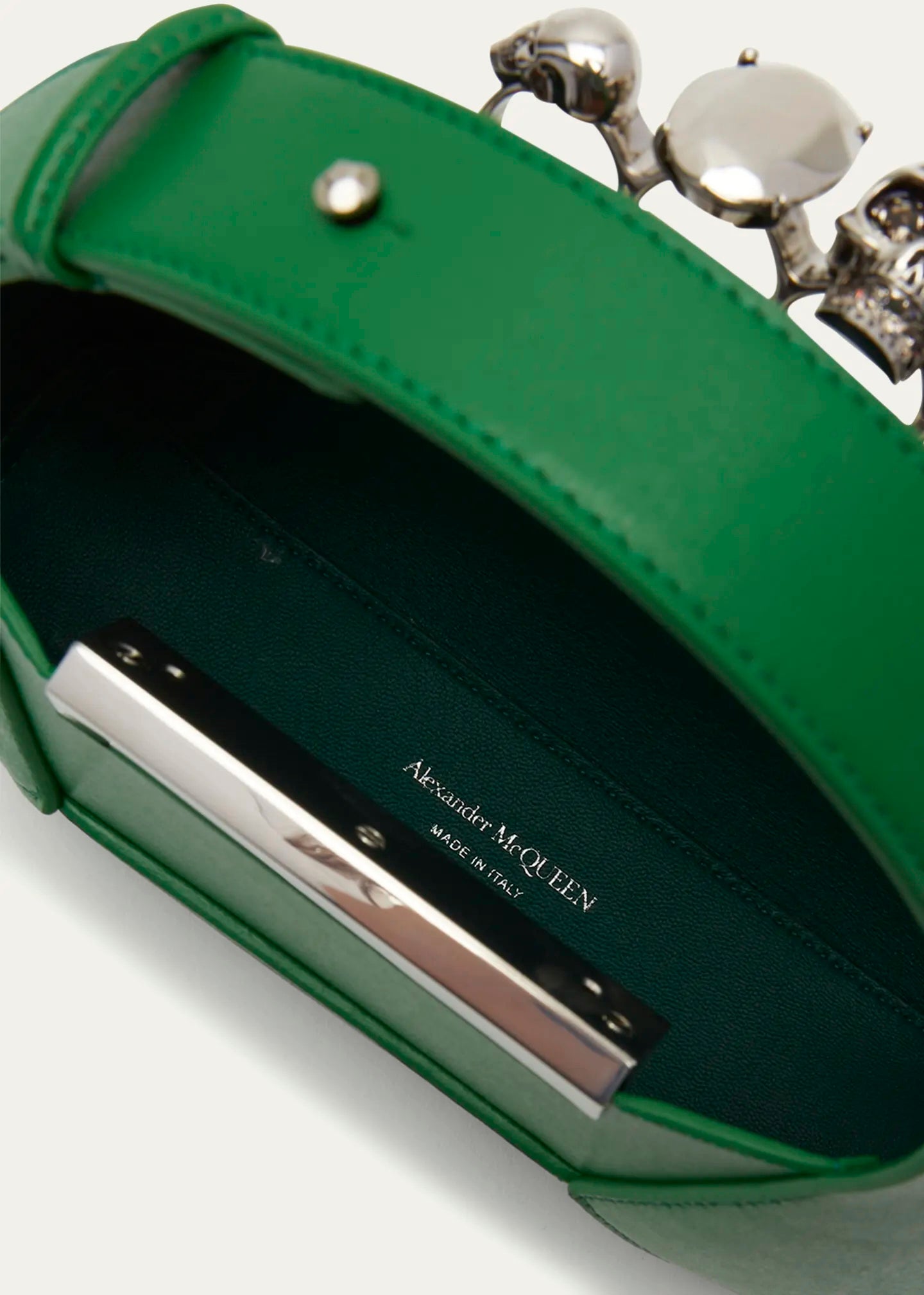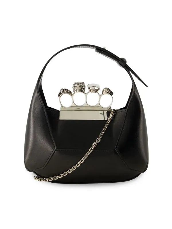 - Framed top with signature skull four-ring knuckle duster; lift-clasp closure