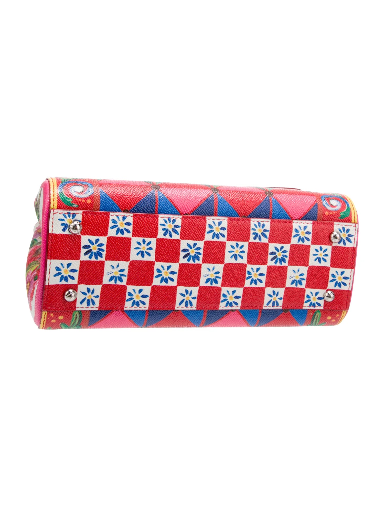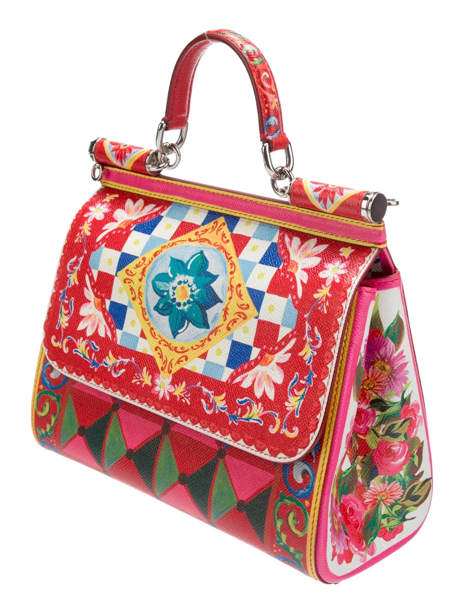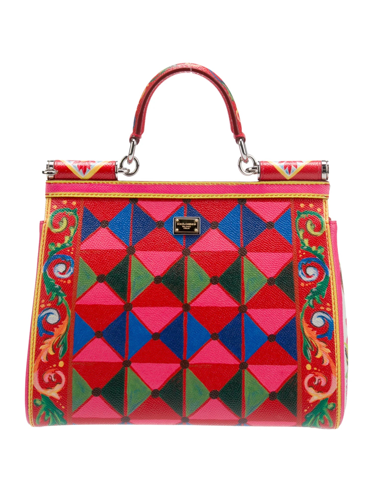 Expertly crafted in Italy, the Dolce & Gabbana Sicily Mambo Print Bag is a sought-after silhouette from the renowned brand's collection. Made from textured Dauphine leather, it boasts a vibrant multicolor mambo print and a front flap with a hidden snap closure. With a top handle and removable shoulder strap, this spacious bag is ideal for elevating any casual outfit or special occasion attire. Despite some minor marks on the interior lining, the bag remains in impeccable condition, making it a must-have for any fashion-forward individual.