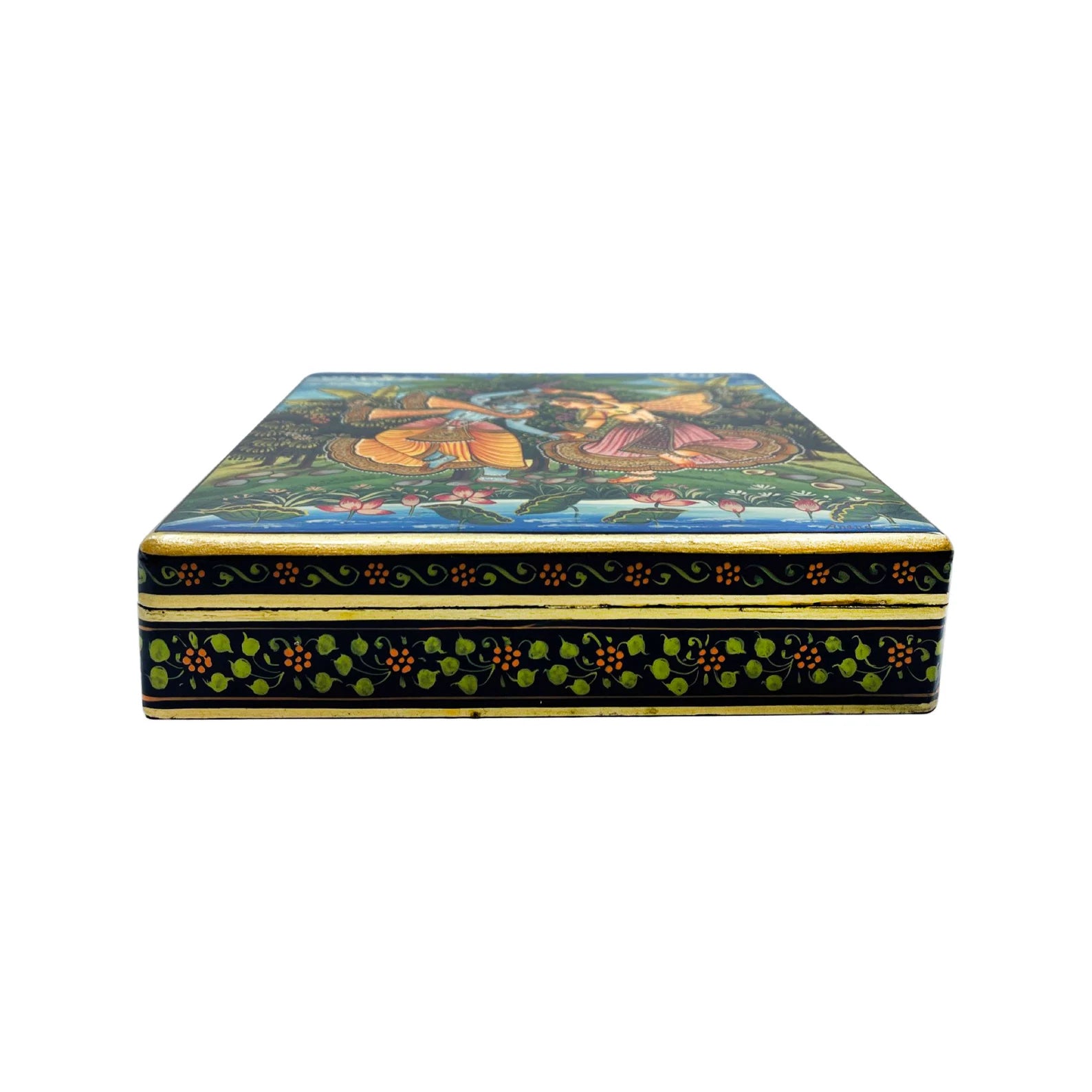 Detailed dancing scene of Lord Krisha with female companion captured in exquisite detail inside a luscious garden paradise. Abundant trees, flowers, and crystalline waters capture this joyful and dynamic scene. You can get a sense of the circular and twirling movement of the dancers as they are spiritually connected. Simply beautiful and one-of-a-kind painted wooden box. The sides of the box are adorned with beautiful flowers and leaf patterns, with a gold frame all around the box.